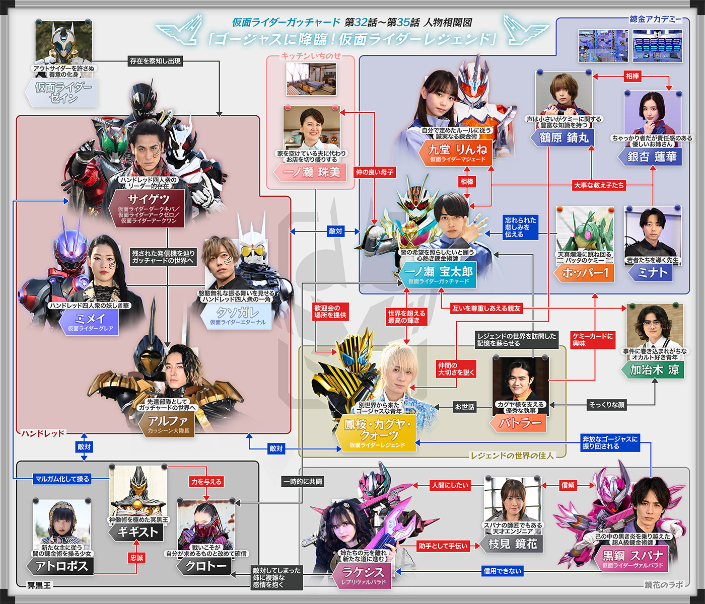 特別な力を持つ〝レベルナンバー10〟の〝ケミー〟「ユーフォーエックス」を得た「仮面ライダーガッチャード」こと一ノ瀬宝太郎は、強制的に「仮面ライダードレッド」に変身させられた鶴原錆丸の救出に成功。大きな苦難を乗り越え、〝錬金アカデミー〟の面々の絆はより深まることとなった。だが、その裏で〝冥黒の三姉妹〟の主である〝闇の錬金術師〟グリオンが動き出す。