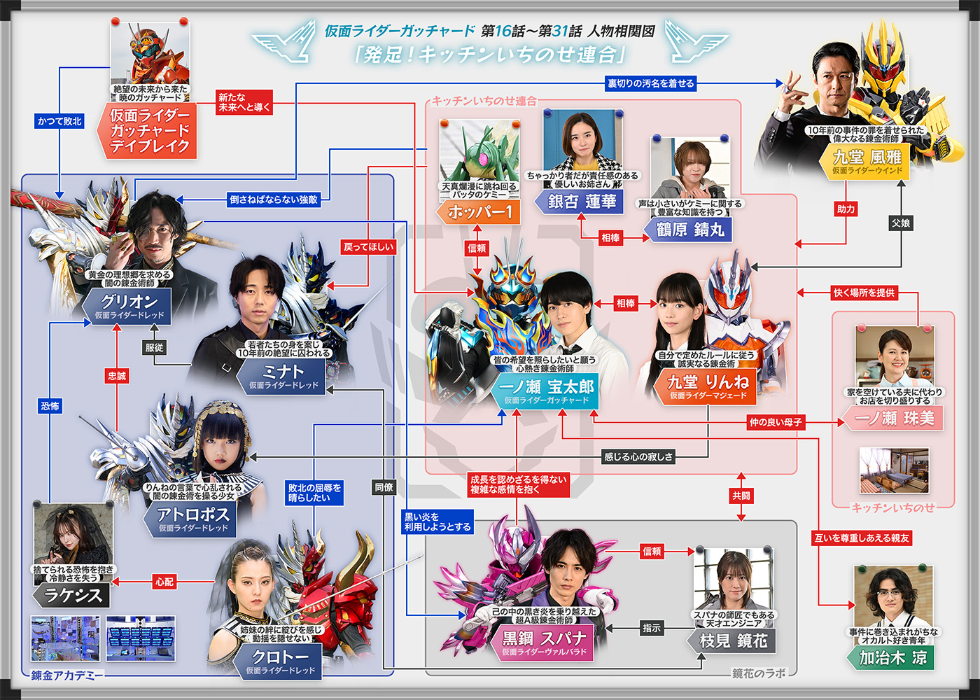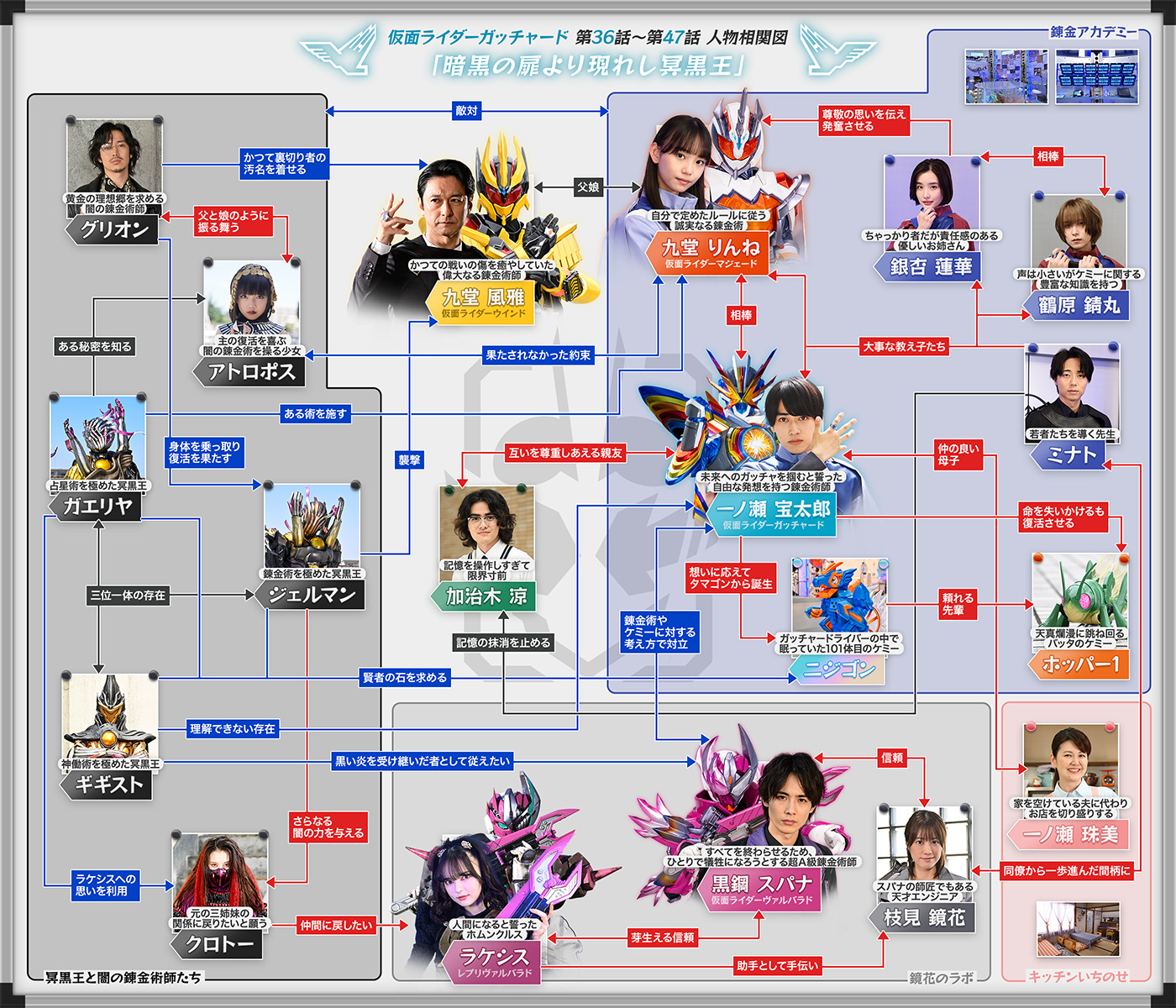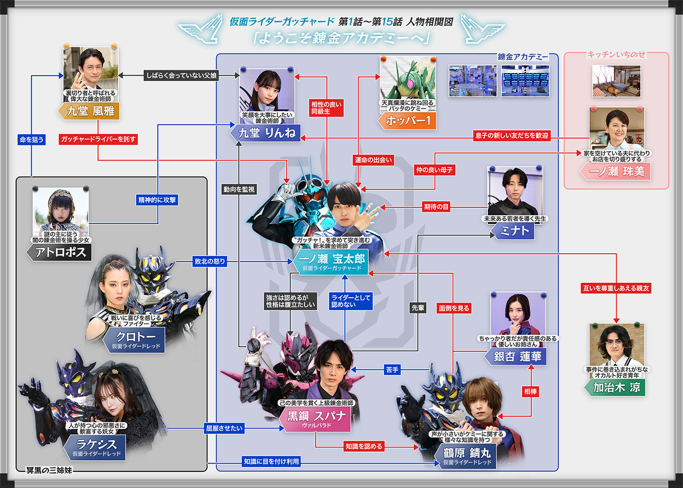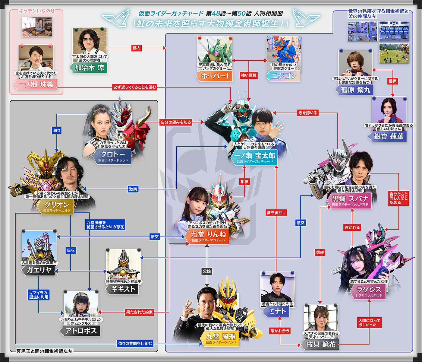 そんな彼らの前に立ち塞がるのは、〝冥黒の三姉妹〟の異名を持つ闇の錬金術師、アトロポス、クロトー、ラケシス。彼女たちはケミーを人が持つ悪意に染めることで誕生する怪人「マルガム」を使役し、〝世界を滅ぼす鍵〟でもあるガッチャードライバーを奪わんとする。そんな悪の胎動に対し、アカデミーを管理する組織〝錬金連合〟も黙っておらず、助っ人としてミナトの後輩にして〝超A級錬金術師〟の肩書きを持つ黒鋼スパナを派遣。自らが生み出した特殊錬成武具「ヴァルバラッシャー」を使用し、戦士「ヴァルバラド」へと変化できる力を持つスパナは、アカデミーの確かな力となるが、宝太郎に対しては「仮面ライダーとして認めるわけにはいかない」と糾弾し、その戦いやケミーに対する考え方を真っ向から否定。スパナを見返すべく奮闘する宝太郎だったが、同時に自分の未熟さも痛感するという歯がゆい思いをすることに。