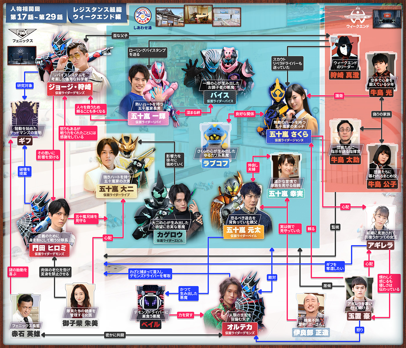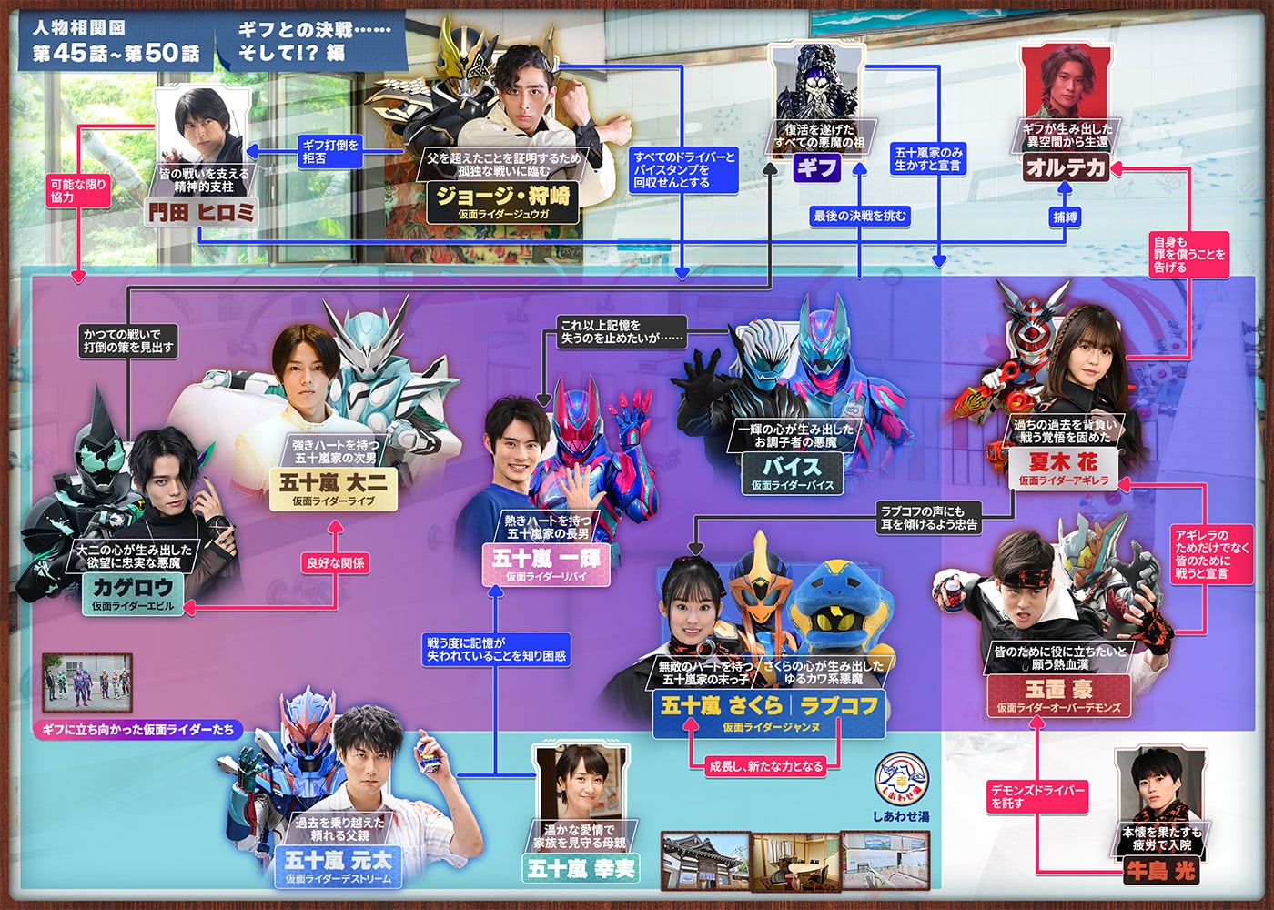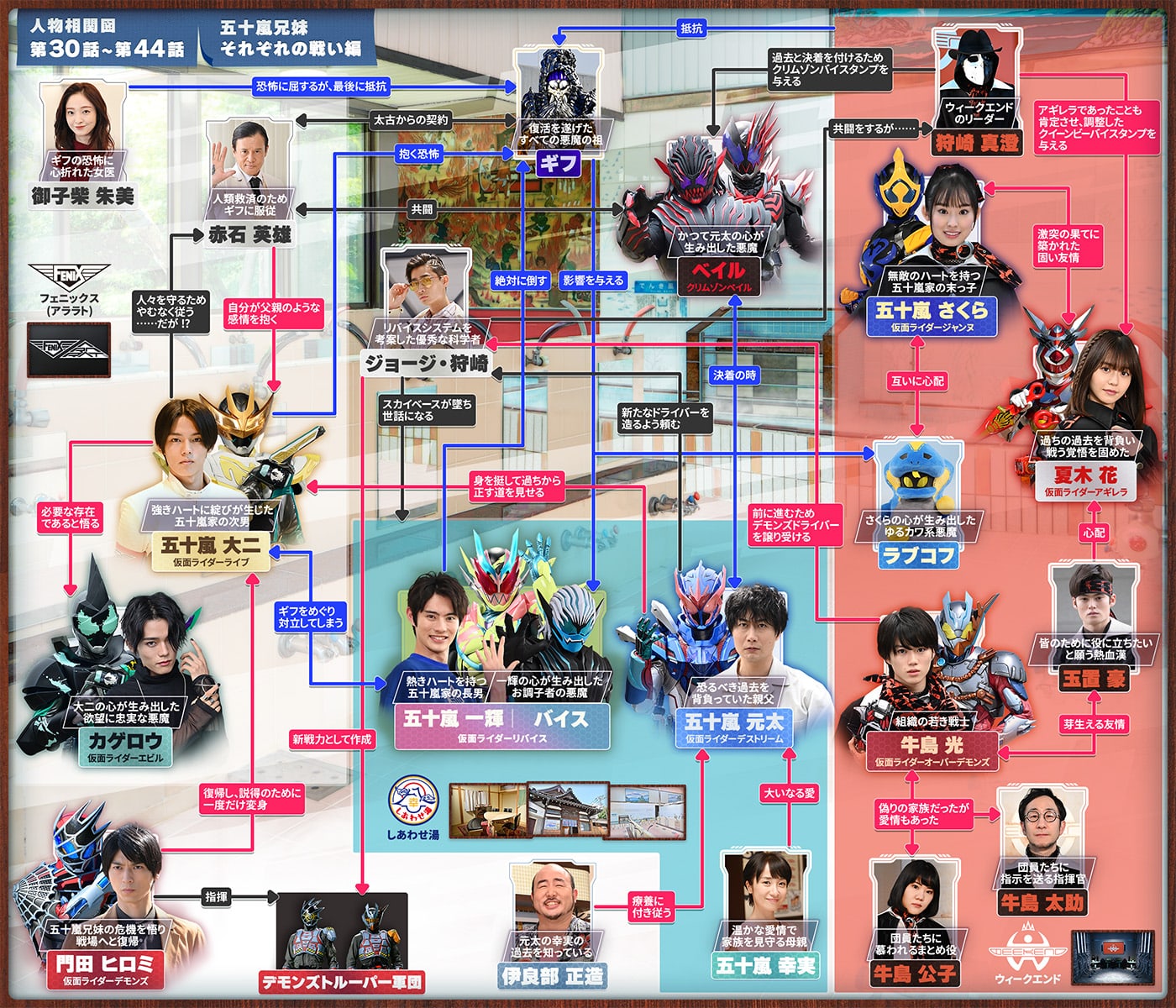 こうして父母とともに銭湯を経営するなかで、必要に応じてデッドマンズとの戦いに駆り出されることとなった一輝とバイス。やがて戦いが加速していくと、大二の中では悪魔のカゲロウが、さらには末っ子の五十嵐さくらの中では悪魔のラブコフが覚醒。大二は己を乗り越える形でカゲロウを制し、さくらは自分の弱さと向き合う形でラブコフと共存する道を選び、大二は「仮面ライダーライブ」、さくらは「仮面ライダージャンヌ」へと変身を果たす。対デッドマンズへの強力な戦力になるのだった。