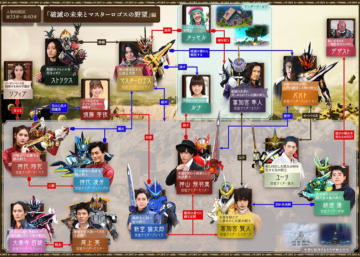 そんな混迷する状況の中、「ソードオブロゴス」の裏切り者が、「サウザンベース」の統治者にして組織の長であるマスターロゴスであると判明。彼は剣士たちが持つすべての聖剣と、それに伴う選ばれし「ワンダーライドブック」、そして世界をつなぐ少女であるルナを手にし、失われた「全知全能の書」の復活を目論む。その野望達成を促進させるべく、破滅の書に封印されていた無の剣士「仮面ライダーファルシオン」ことバハトを解放した。