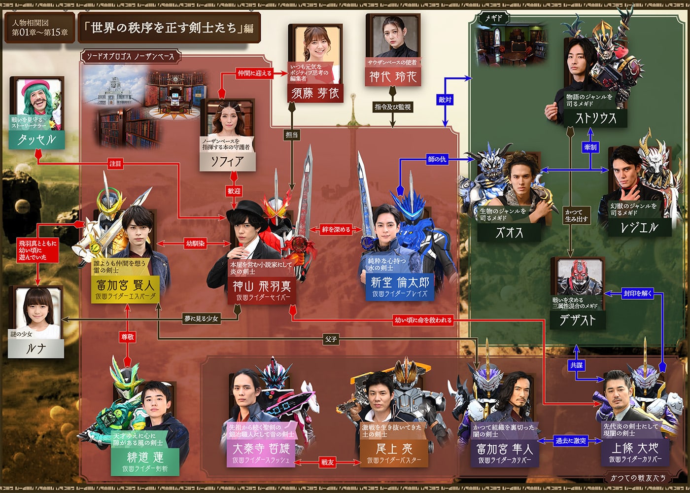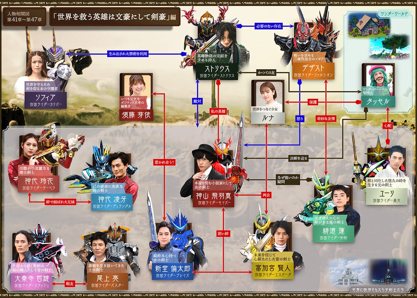 その後、芽依とともに元の世界へと戻った飛羽真は、本屋を訪ねてきた水の剣士「仮面ライダーブレイズ」こと新堂倫太郎の言葉から、現世と異世界「ワンダーワールド」を繋ぎ、新たな世界を創り出そうとしている本の魔物「メギド」の存在、そして、聖剣に選ばれし剣士を擁する組織「ソードオブロゴス」が、世界の均衡を保つため、メギドと戦っていることを知る。