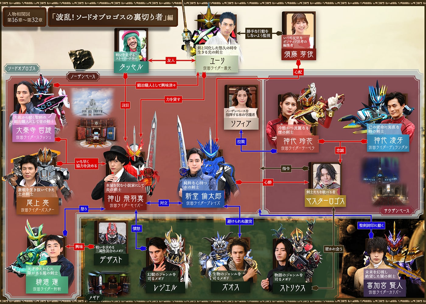 さらに、火炎剣烈火の真の力を引き出す者が戦いを終わらせるという、先祖伝来の伝承を信じている鍛冶職人にして音の剣士「仮面ライダースラッシュ」こと大秦寺哲雄、そして大秦寺とは古くからの戦友である土の剣士「仮面ライダーバスター」こと尾上亮が、本気で剣を交えたことで飛羽真の真意を感じ取り、彼への助力を決意。